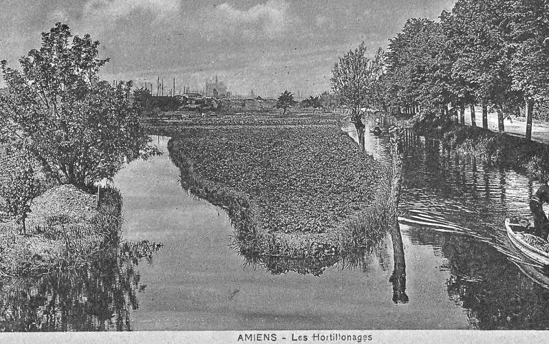 Drijvende eilanden in “les Hortillonnages”te Amiens (postkaart van rond 1900, publiek domein)